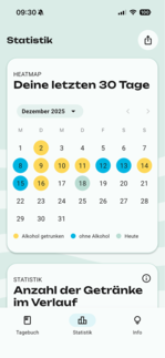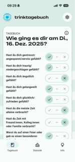 In der integrierten Tagebuchfunktion beantworten Sie kurze Fragen zu Ihrer Stimmung, sozialen Faktoren, Trinkanlässen und Situationen. So können Sie mögliche Muster in Ihrem Trinkgewohnheiten erkennen und sich übersichtlich auswerten lassen. Die einfache, intuitive Bedienung wird durch hilfreiche Info-Buttons ergänzt.