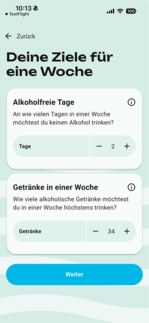 Zu Beginn – und jederzeit später in den Einstellungen – können Sie sich persönliche Ziele zu Ihrem Alkoholkonsum setzen, zum Beispiel: Wie viele alkoholfreie Tage Sie pro Woche mindestens einhalten oder wie viele alkoholische Getränke Sie maximal innerhalb einer Woche konsumieren möchten. Ihren Konsum tragen Sie direkt oder im Nachhinein ein. Dabei lassen sich die vordefinierten Getränke jederzeit anpassen: Menge (in Litern) und Alkoholgehalt (Vol.-%) können verändert, eigene Getränke hinzugefügt oder auch wieder gelöscht werden.