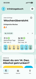 Die DHS App „Trinktagebuch“ ersetzt nicht den Besuch beim Arzt bzw. bei einer Ärztin, einer Selbsthilfegruppe oder einer Suchtberatungsstelle. Sie möchte dabei unterstützen, die Menge und Häufigkeit Ihres Alkoholkonsums zu reflektieren und sich mit Ihrem eigenen Trinkverhalten auseinanderzusetzen. Falls Sie Schwierigkeiten haben, Ihre selbst gesteckten Ziele zu erreichen, zeigt Ihnen die DHS Trinktagebuch App Wege in die Sucht-Selbsthilfe und zu professionellen Beratungsangeboten.
